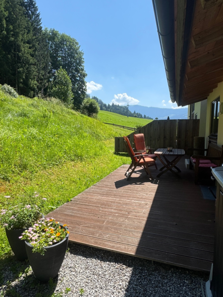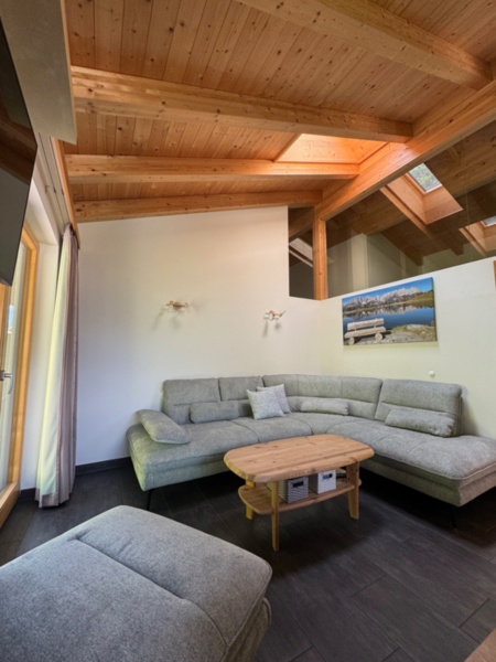 Durch den eigenen Eingang betreten Sie den Flur der in weitere Räume führt. Das gemütliche Wohnzimmer mit Ecksofa, Fernseher und Blick auf den Hang mit Wald und seitlich die Berge bzw. die Skipiste.